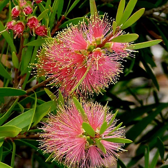 The Bottle Brush 'Pink Champagne' (Callistemon 'Pink Champagne') is an eye-catching evergreen shrub, known for its soft, champagne-pink flower spikes that resemble a bottle brush. These fluffy, cylindrical blooms appear in late spring to early summer, sometimes re-blooming in autumn under ideal conditions. Reaching up to 6–10 feet tall with a similar spread, this plant’s narrow, leathery green leaves provide a lush backdrop that highlights its delicate flowers. It thrives in full sun, well-drained soil, and is drought-tolerant once established, making it a low-maintenance yet striking addition to gardens in USDA zones 8–11. Additionally, its nectar-rich blooms attract birds, bees, and butterflies, adding life and color to any garden landscape.