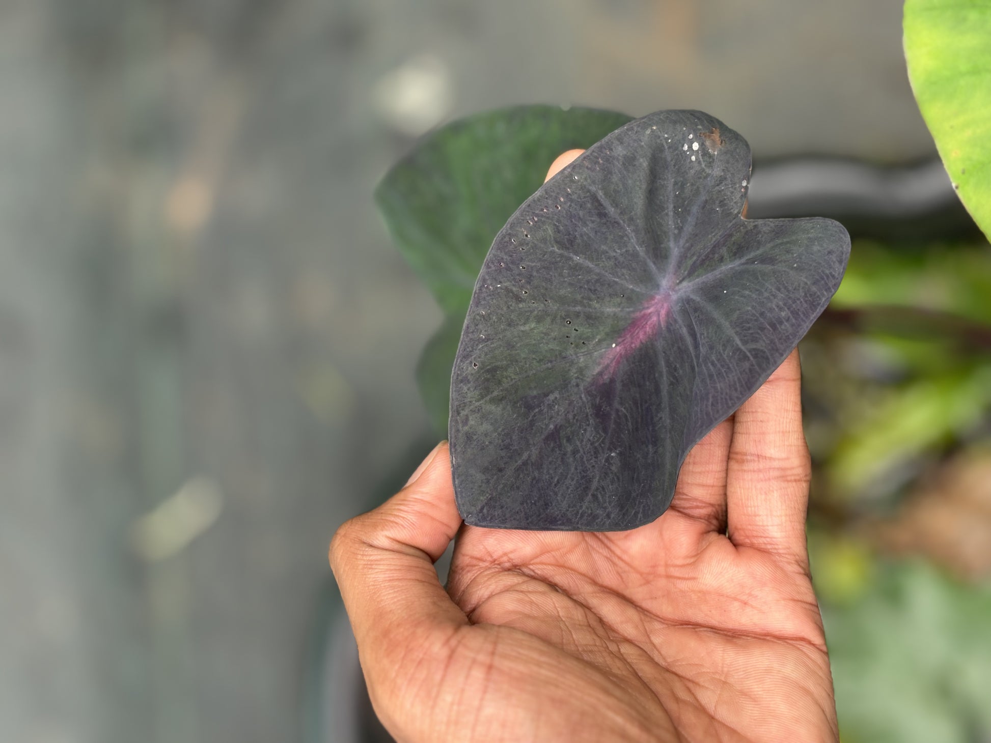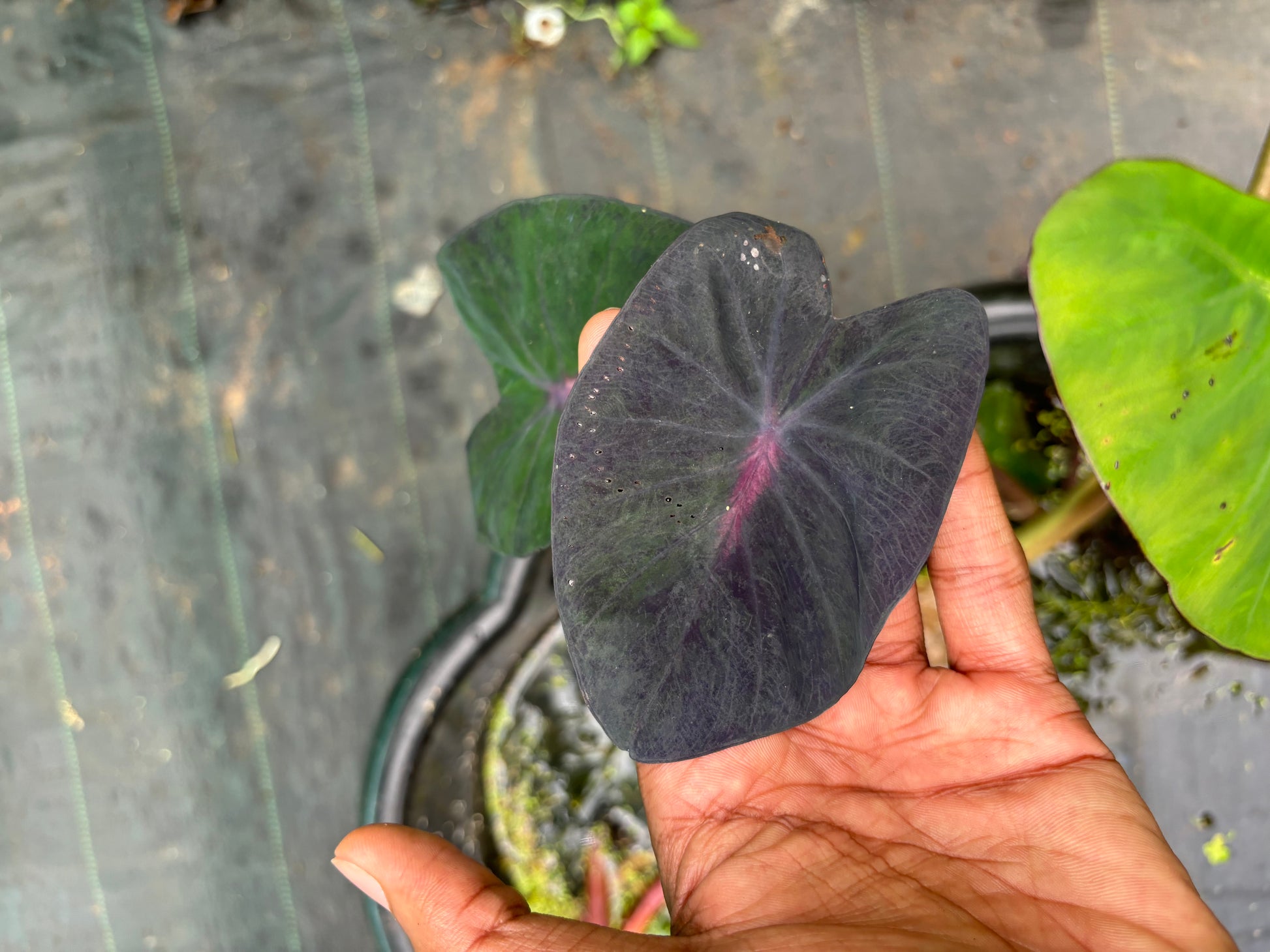 Colocasia 'Black Coral', commonly known as Elephant Ear, is a striking plant known for its deep, nearly black foliage and large, heart-shaped leaves. It makes an excellent addition to any indoor or outdoor garden.